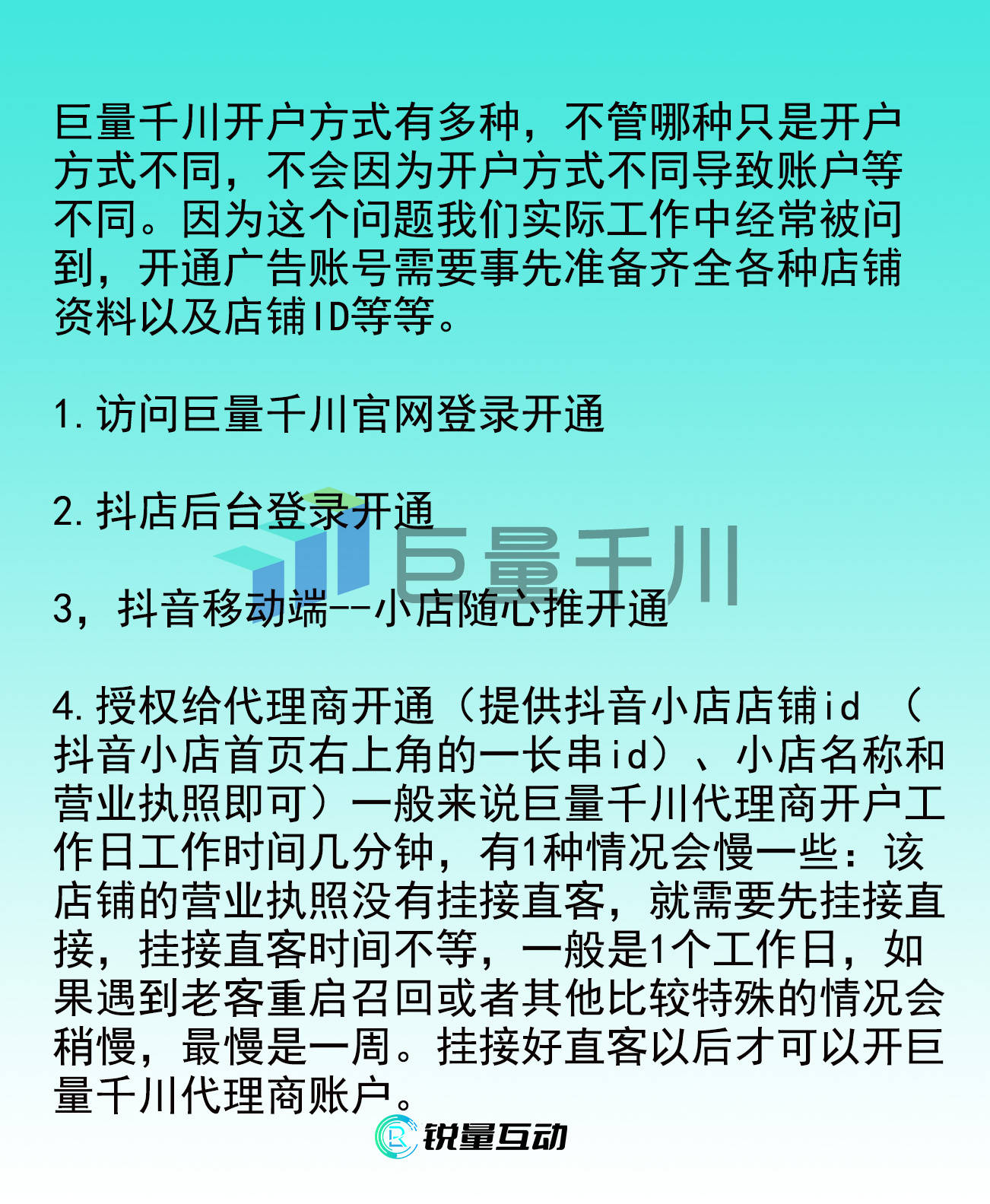 巨量千川开户方式有多种,不管哪种只是开户方式不同,不会因为开户方式不同导致账户等不同。因为这个问题我们实际工作中经常被问到,开通广告账号需要事先准备齐全各种店铺资料以及店铺ID等等。